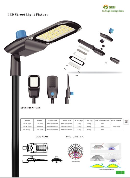 | EK-BL04(S) | 618*230*116 | 20w-80w (cột đèn 60mm) | Vỏ nhôm, Kính cường lực, Vòng cao su, Ốc vít |