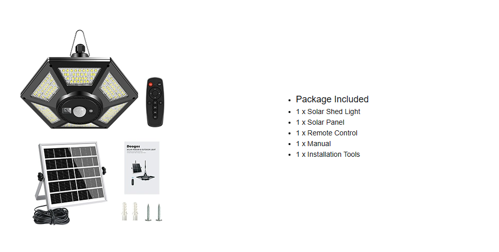 | Included Components | Solar Panel, Remote Control, Mounting Hardware, Light Fixture |